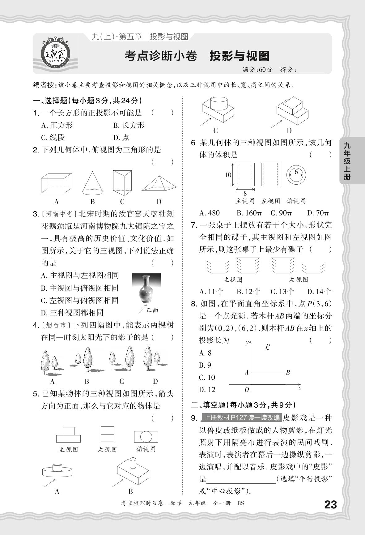 2024上册九年级数学北师版 第五章 考点诊断小卷 投影与视图