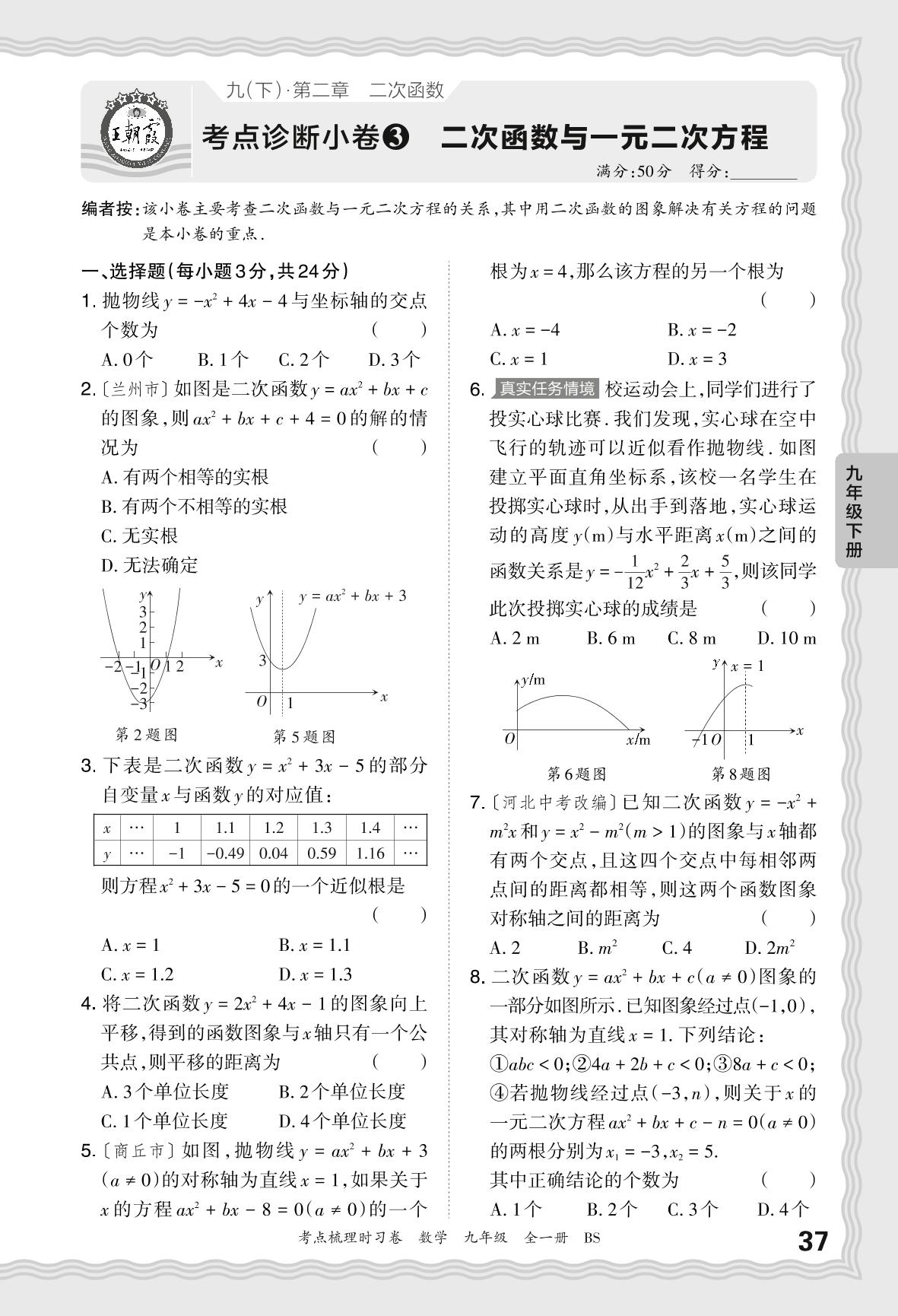 2025下册九年级数学北师版 第二章 考点诊断小卷3 二次函数与一元二次方程