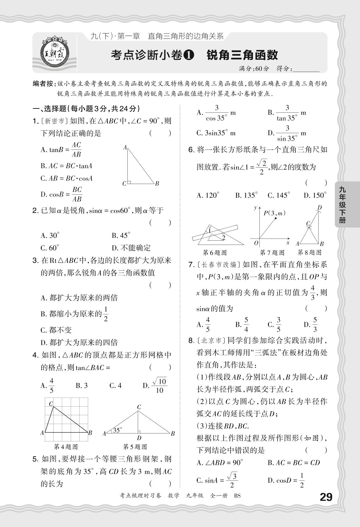 2025下册九年级数学北师版 第一章 考点诊断小卷1 锐角三角函数