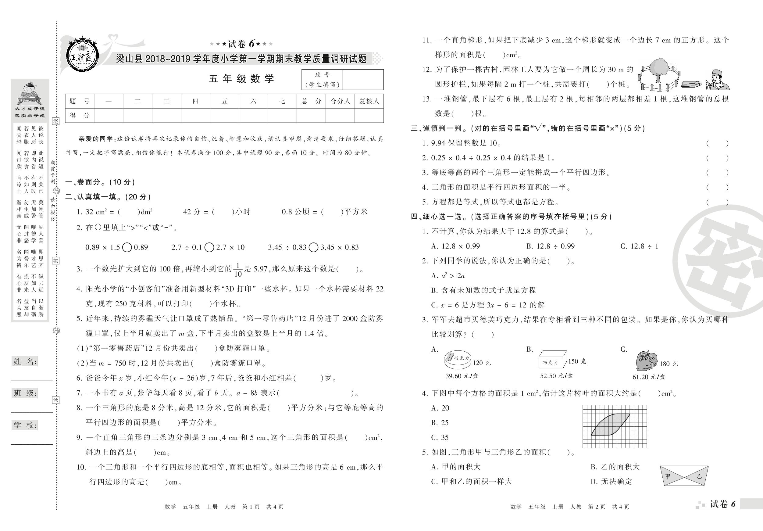 2018-2019学年第一学期济宁市梁山县五年级数学试卷(人教版)【6】
