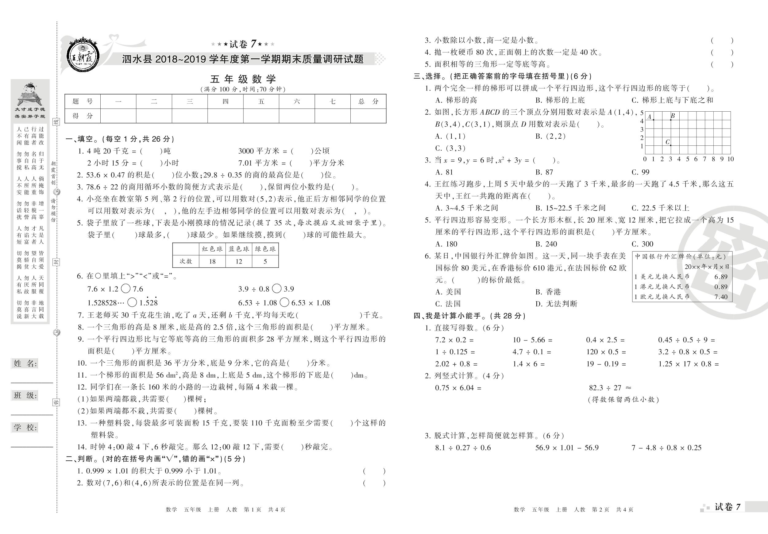 2018-2019学年第一学期济宁市泗水县五年级数学试卷(人教版)【7】
