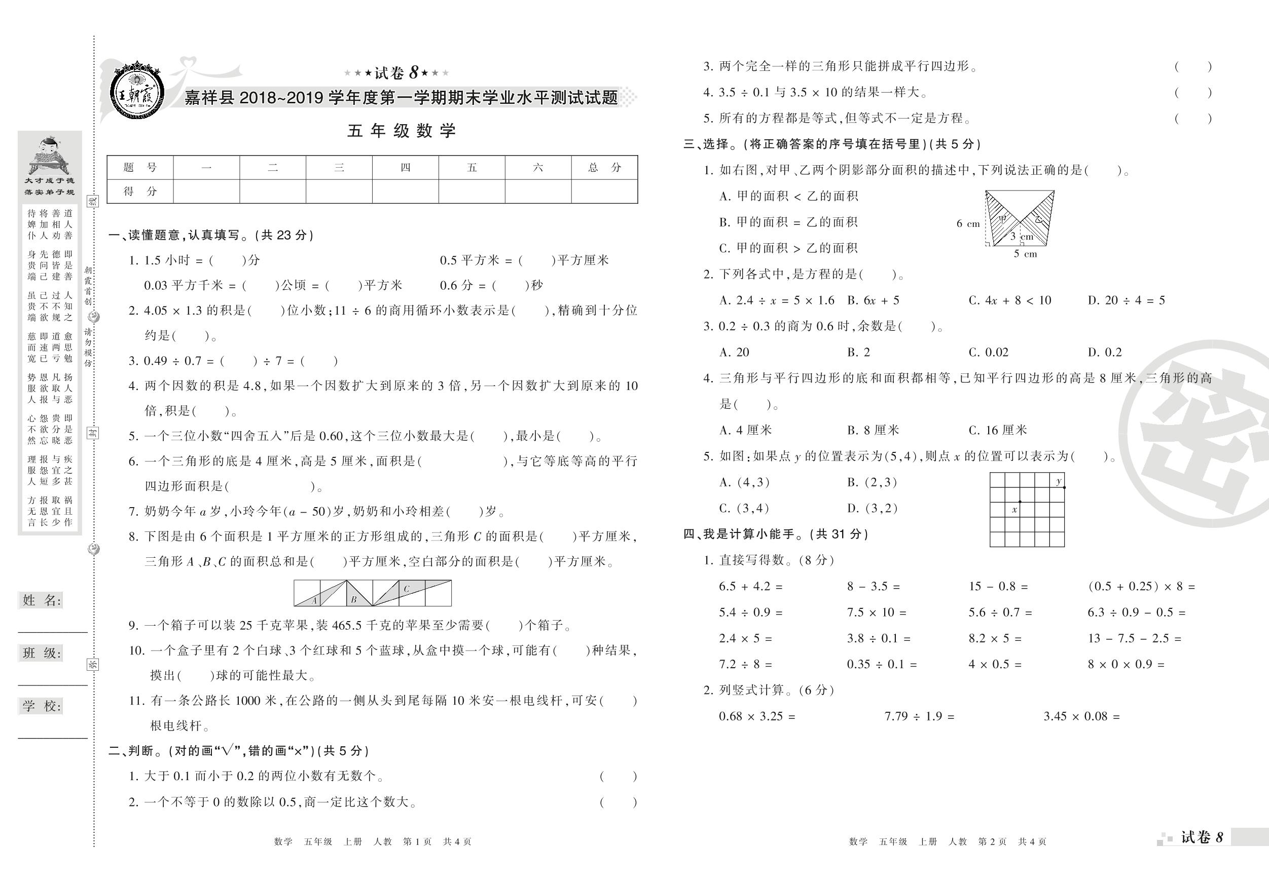 2018-2019学年第一学期济宁市嘉祥县五年级数学试卷(人教版)【8】