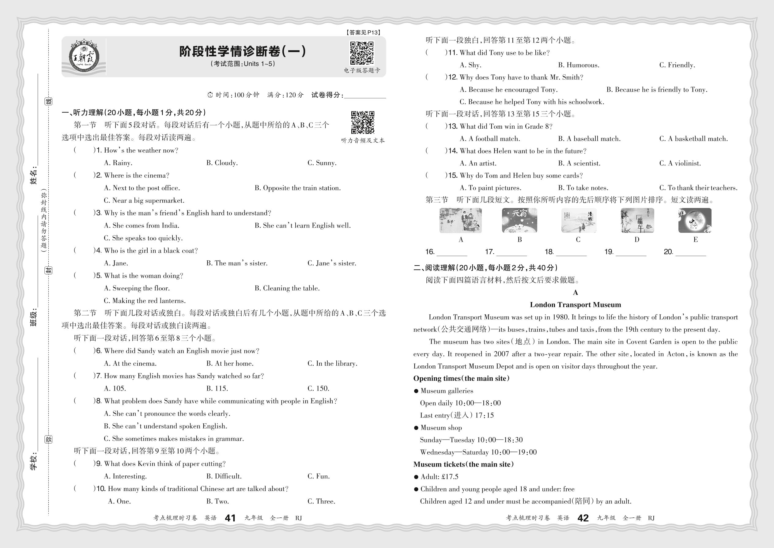 2024-2025学年九年级英语人教版 阶段性学情诊断卷(一)