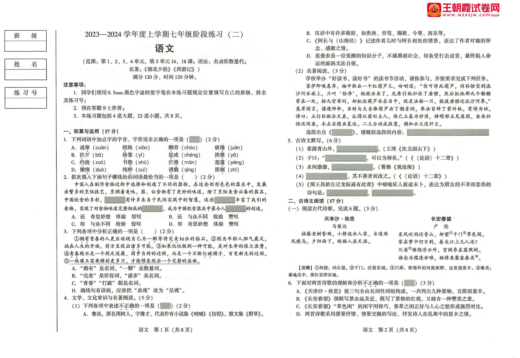 七年级语文人教版上册月考卷