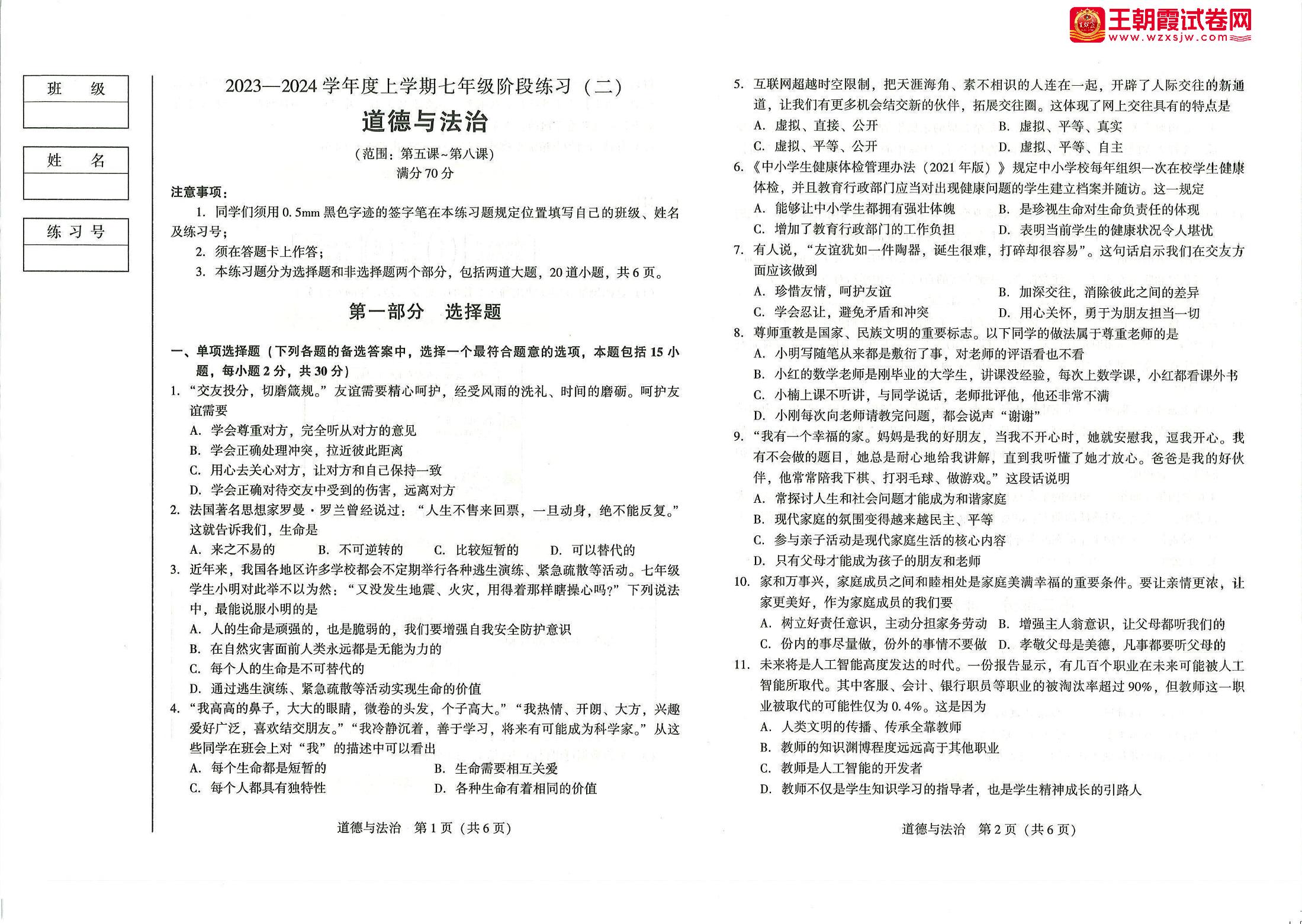 辽宁省沈阳市2023-2024学年度上学期阶段练习11月月考七年级道德与法治(人教版)