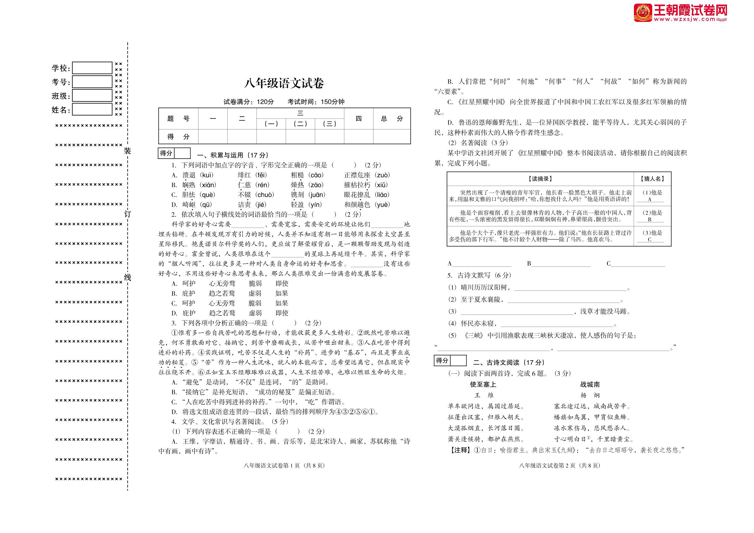 八年级语文人教版上册期中卷