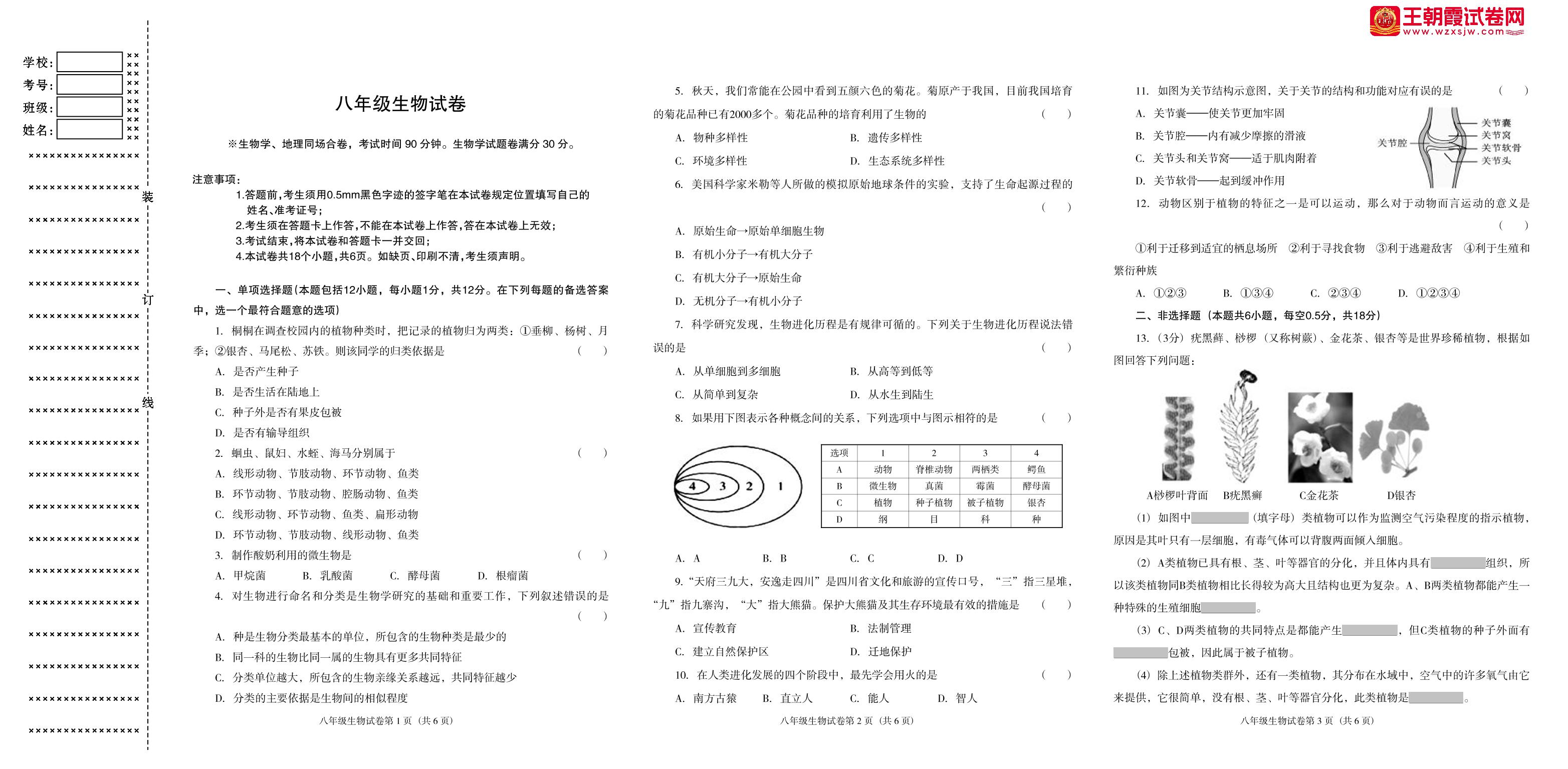 辽宁省沈阳市于洪区2023-2024学年上学期期中考试试卷八年级生物(人教版)