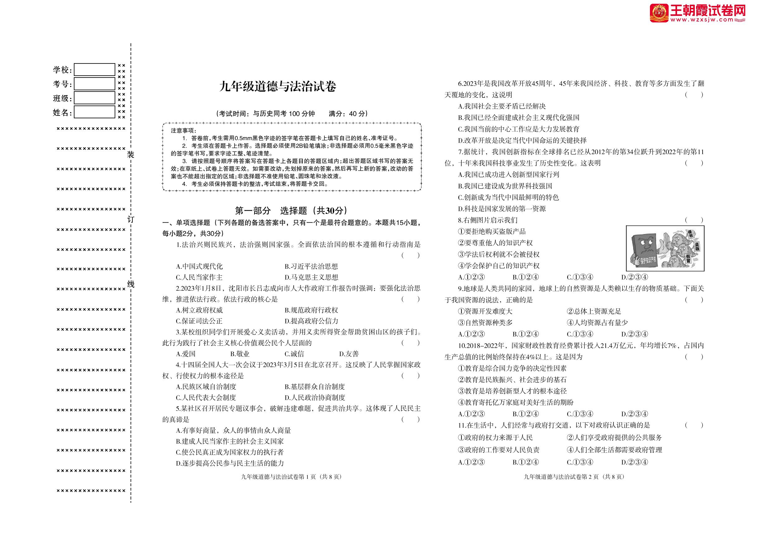 辽宁省沈阳市于洪区2023-2024学年上学期期中考试试卷九年级道德与法治(人教版)