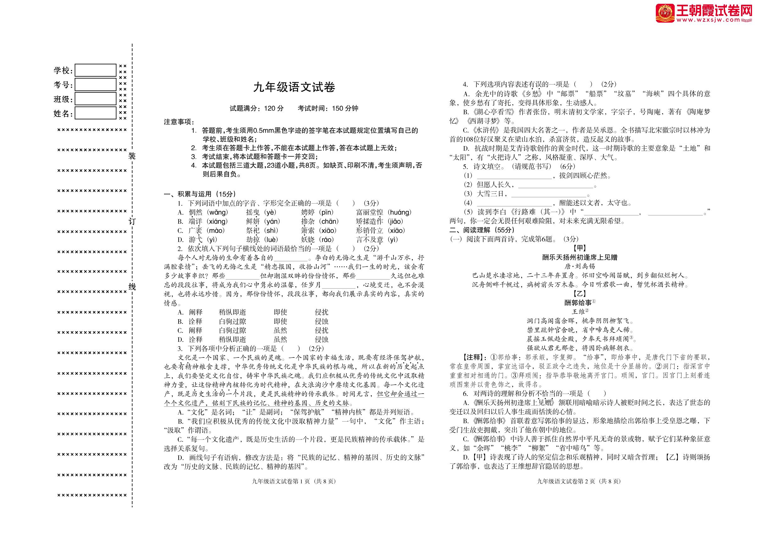 九年级语文人教版上册期中卷