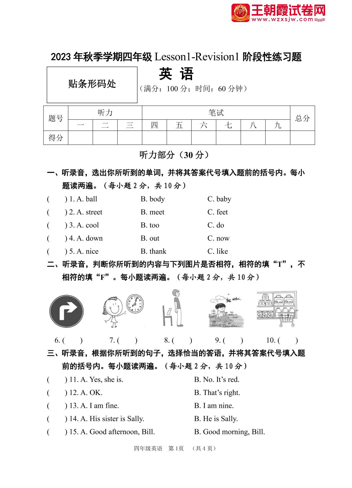 广西贺州市八步区2023-2024学年上学期期中阶段练习四年级英语(人教PEP版)【无听力音频】