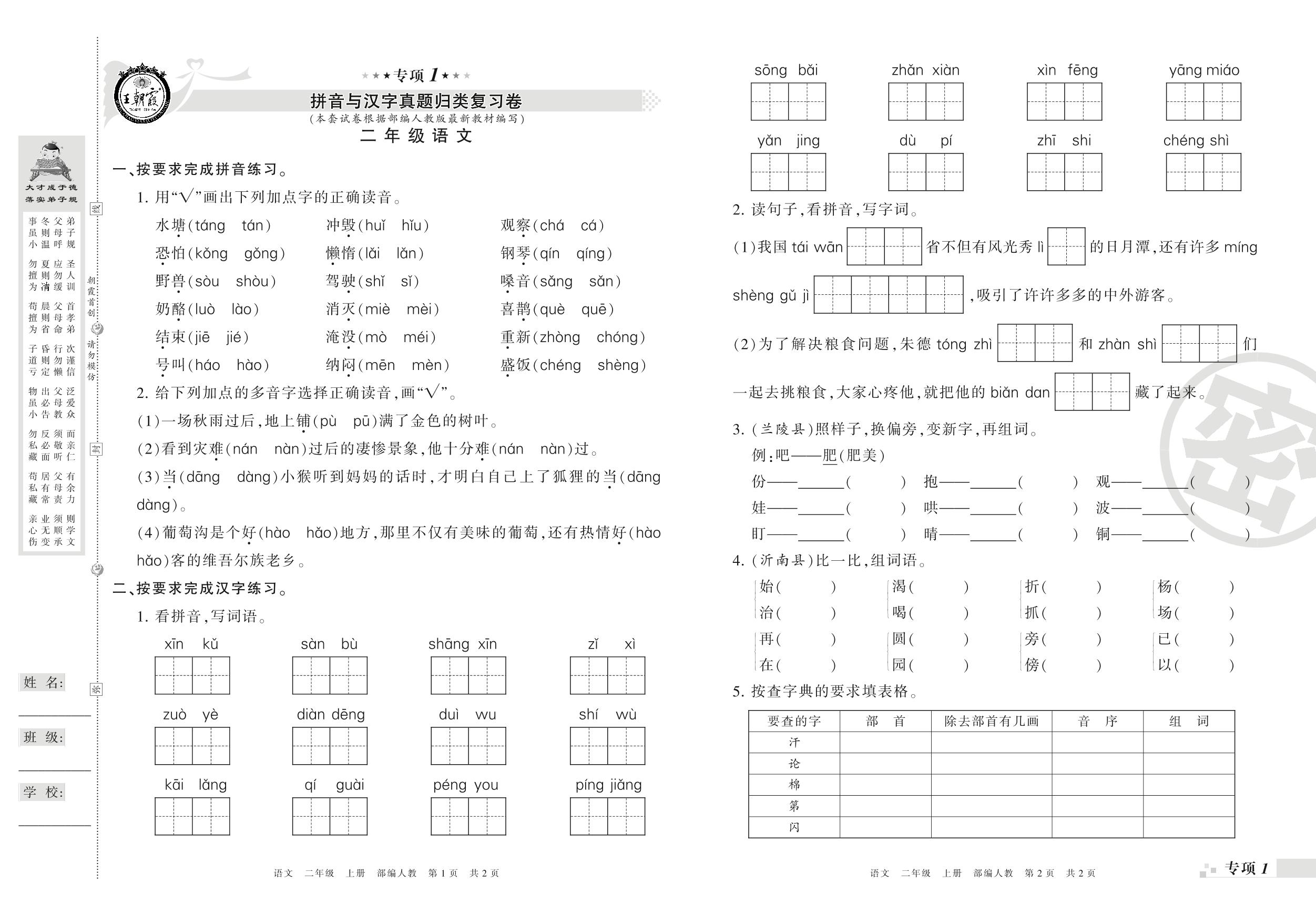 王朝霞期末专项卷——拼音与汉字、词语与句子真题归类复习卷二年级上册语文(人教版)_R21080171122【0】