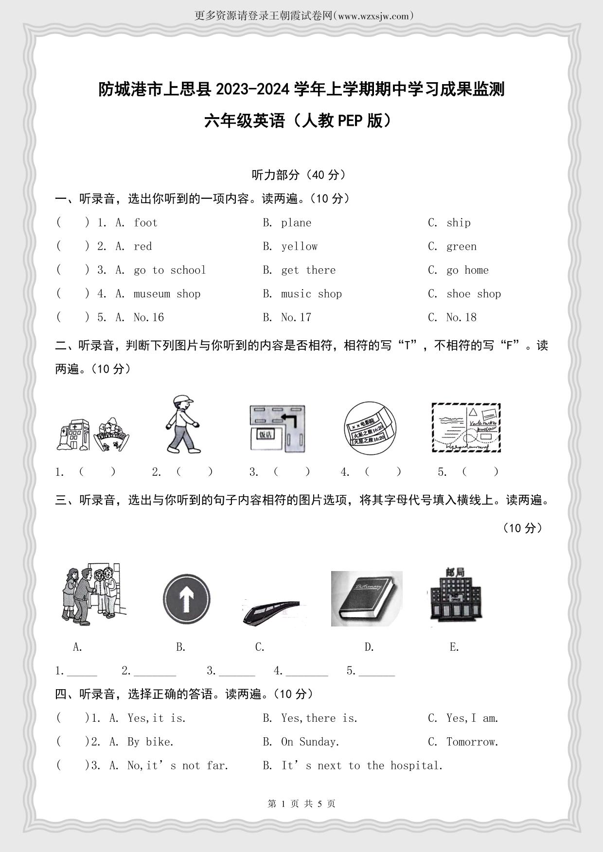 广西防城港市上思县2023-2024学年上学期期中学习成果监测六年级英语(人教PEP版)【无听力音频】
