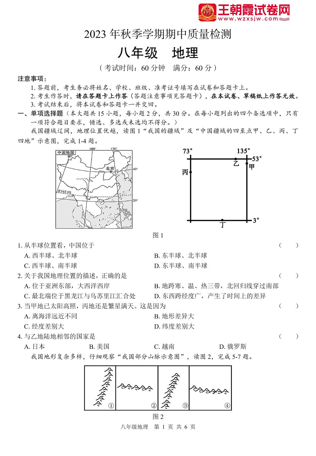 广西北海市银海区2023-2024学年上学期期中质量检测八年级地理(商务星球版)
