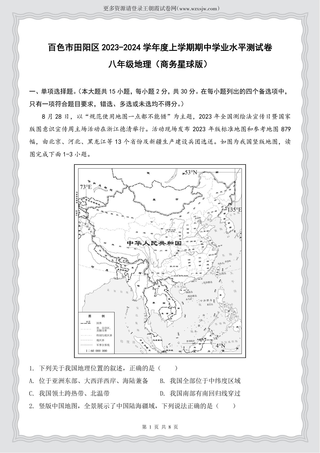 广西百色市田阳区2023-2024学年上学期期中学业水平检测试卷八年级地理八年级地理(商务星球版)