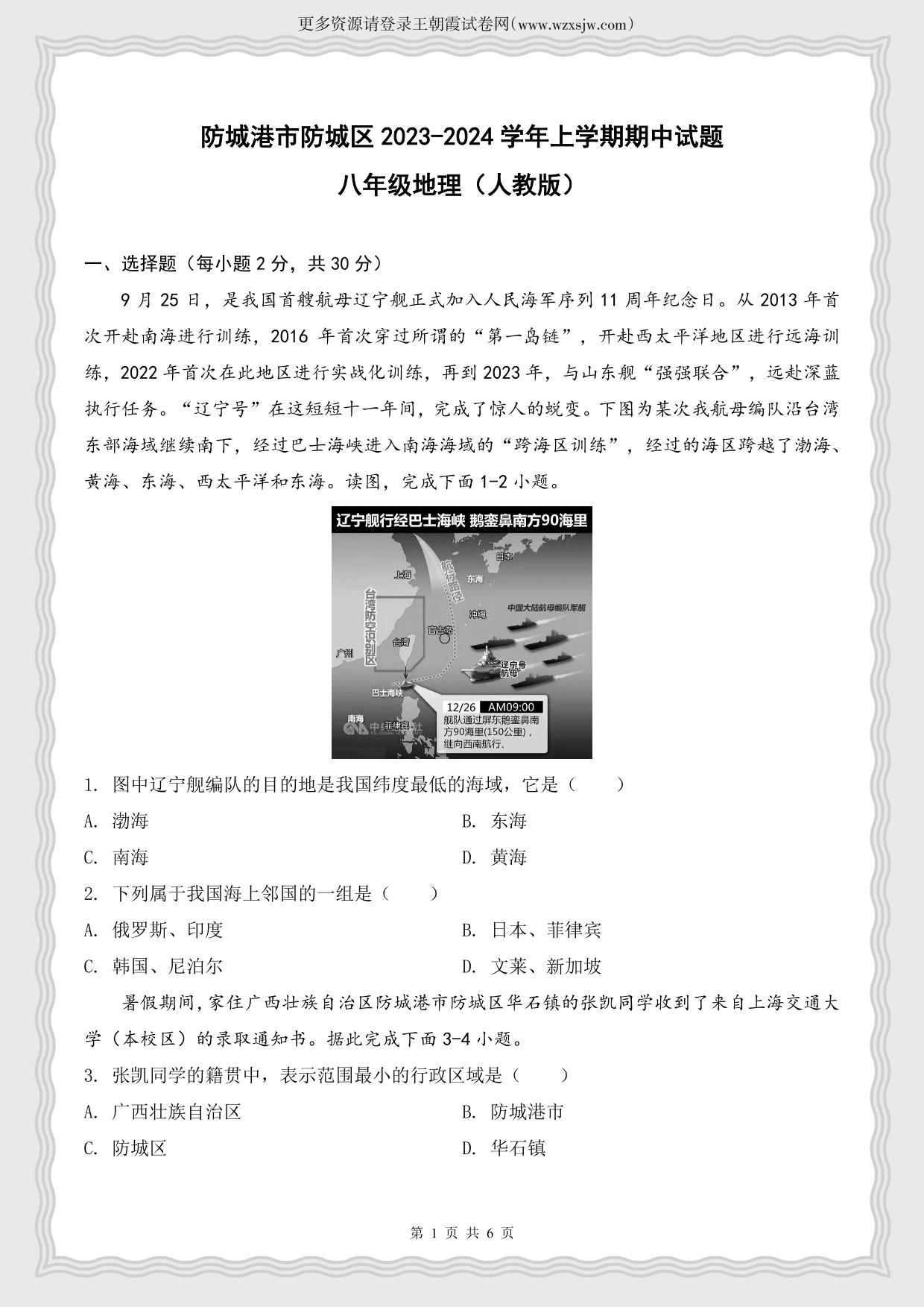广西防城港市防城区2023-2024学年上学期期中试题八年级地理(人教版)