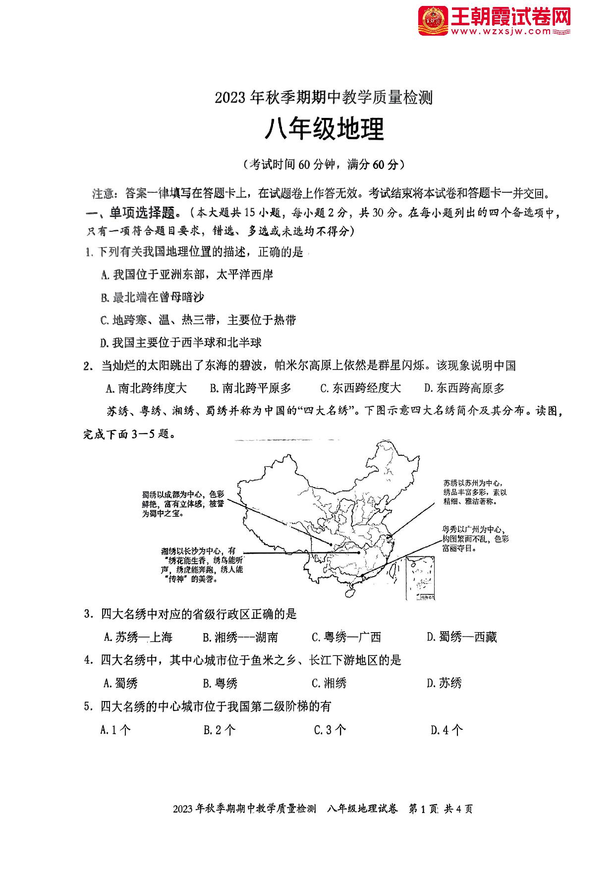 广西贵港市桂平市2023-2024学年上学期期中教学质量检测八年级地理(商务星球版)