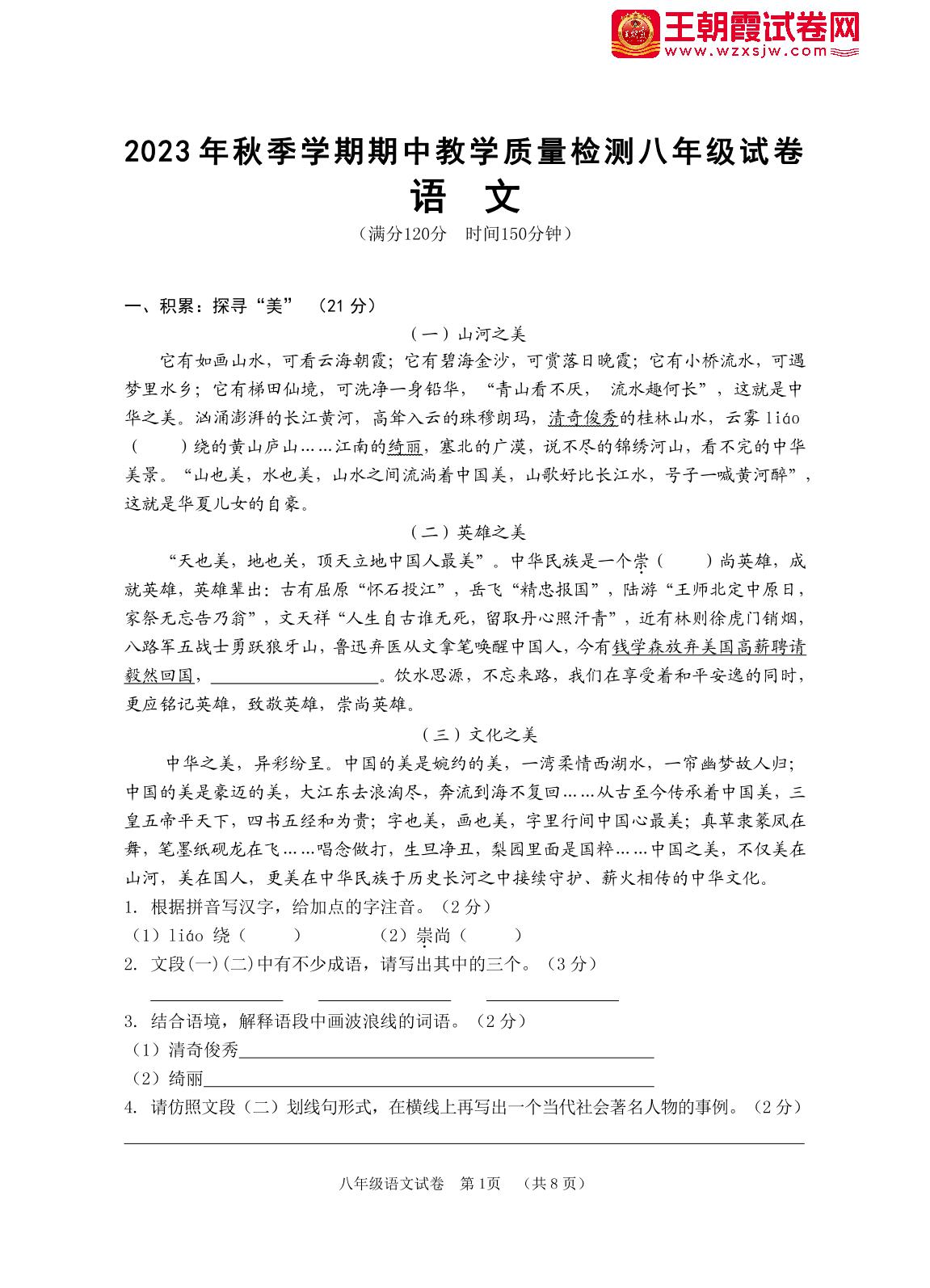 广西贺州市八步区2023-2024学年上学期期中教学质量检测八年级语文(人教版)