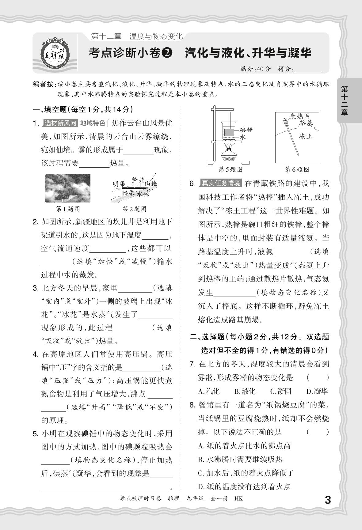 2024-2025学年九年级物理沪科版 第十二章 考点诊断小卷2 汽化与液化、升华与凝华
