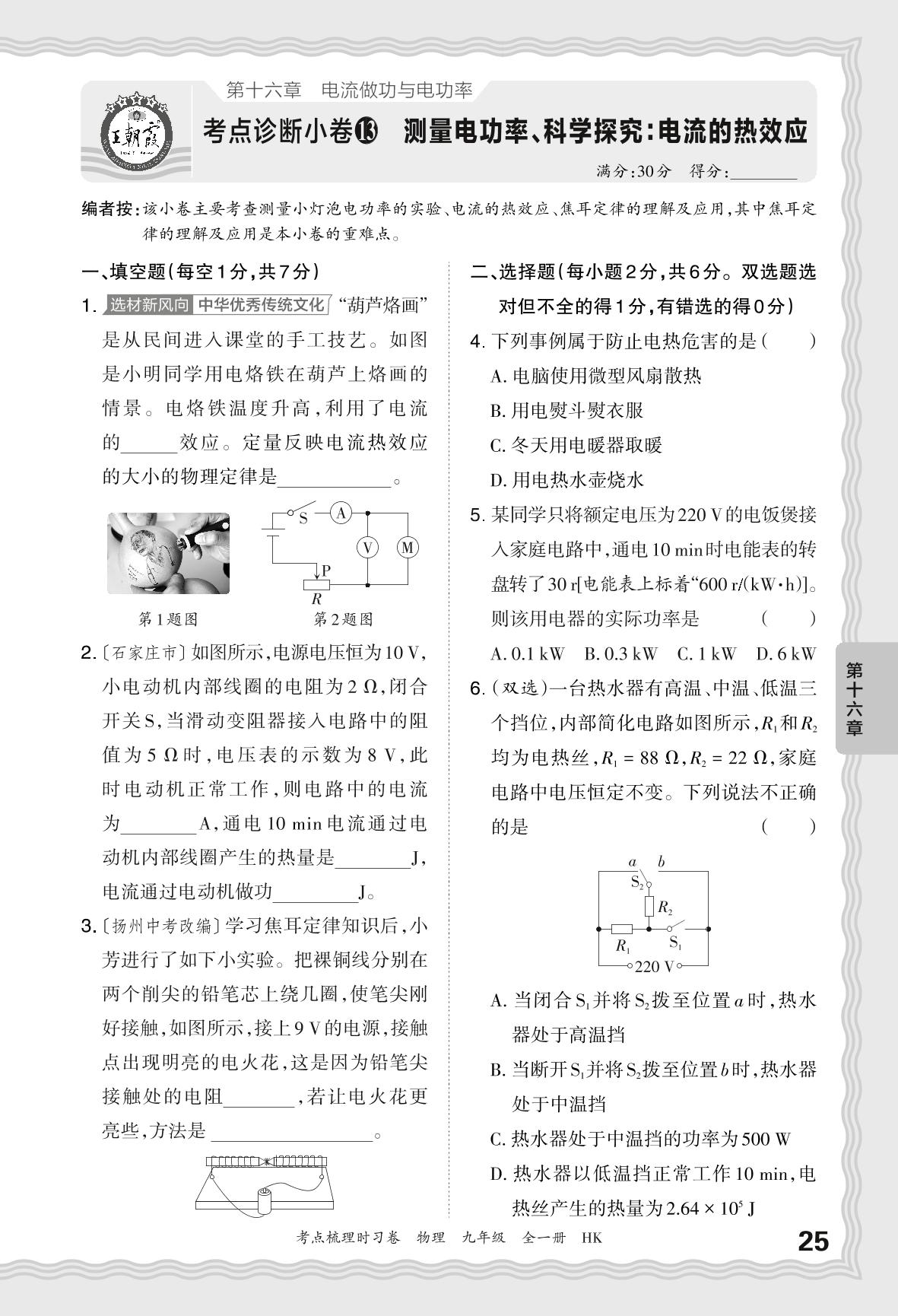 2024-2025学年九年级物理沪科版 第十六章 考点诊断小卷13 测量电功率、科学探究:电流的热效应