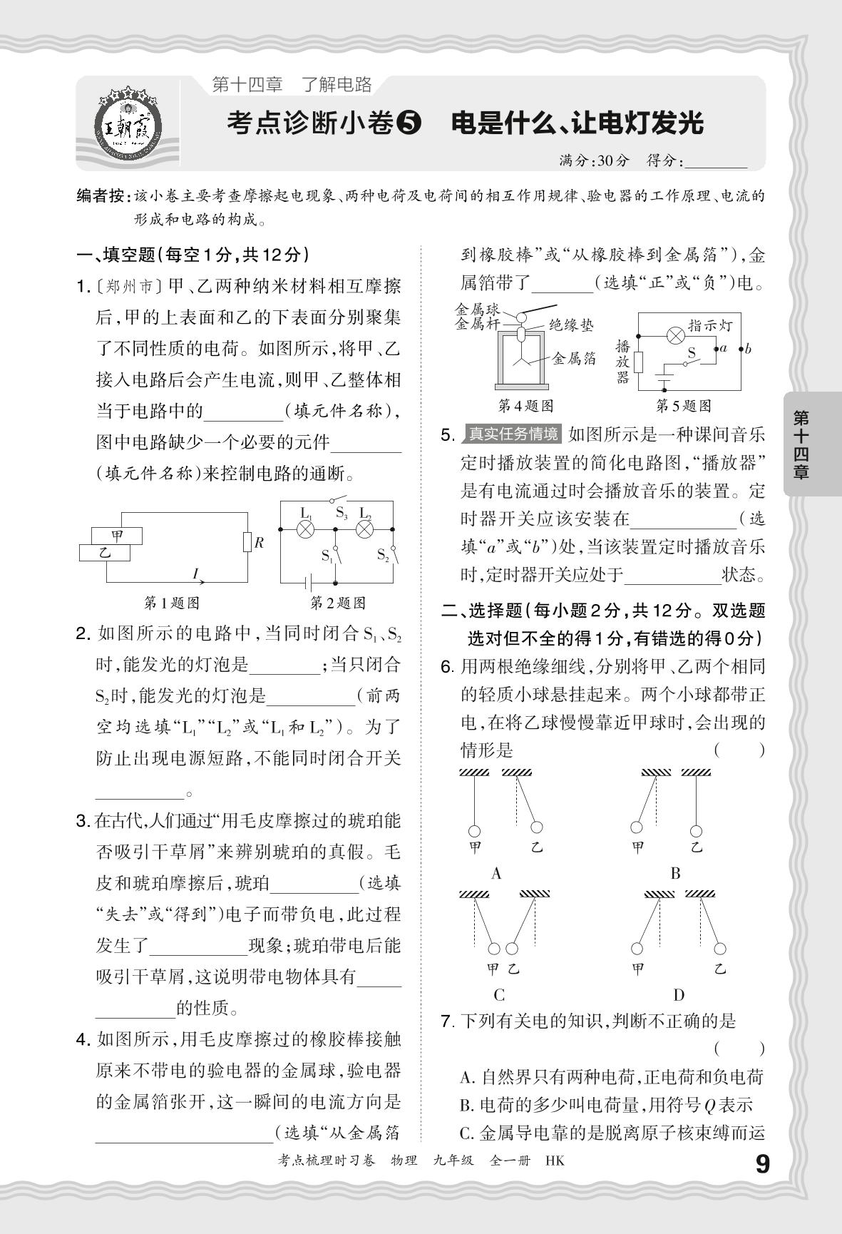2024-2025学年九年级物理沪科版 第十四章 考点诊断小卷5 电是什么、让电灯发光