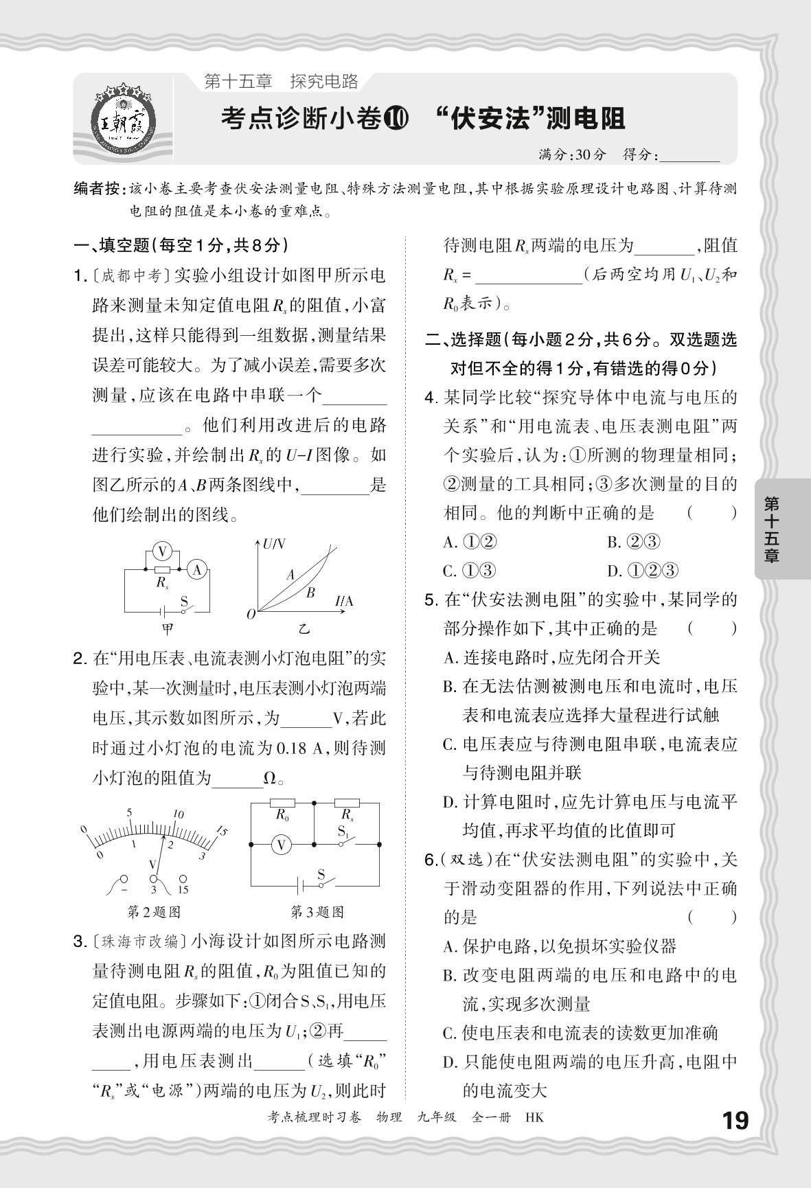 2024-2025学年九年级物理沪科版 第十五章 考点诊断小卷10 “伏安法”测电阻