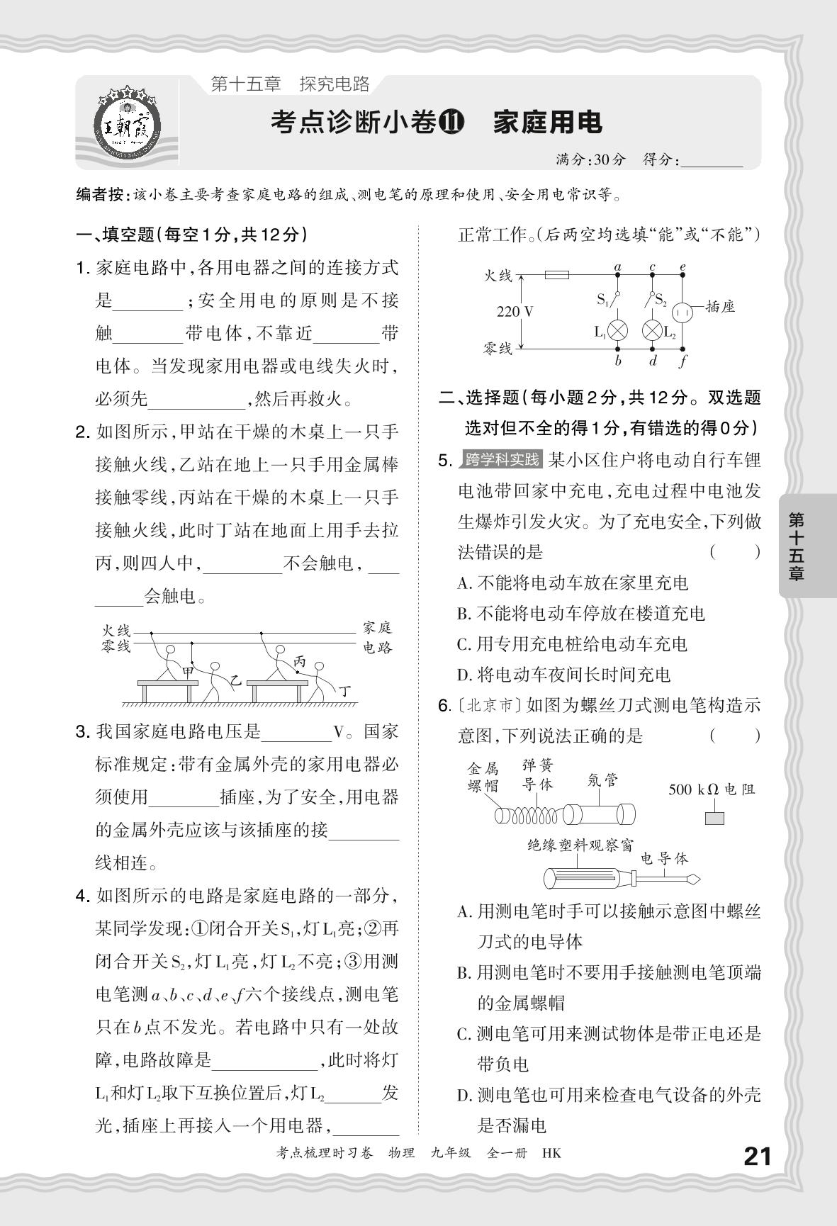 2024-2025学年九年级物理沪科版 第十五章 考点诊断小卷11 家庭用电