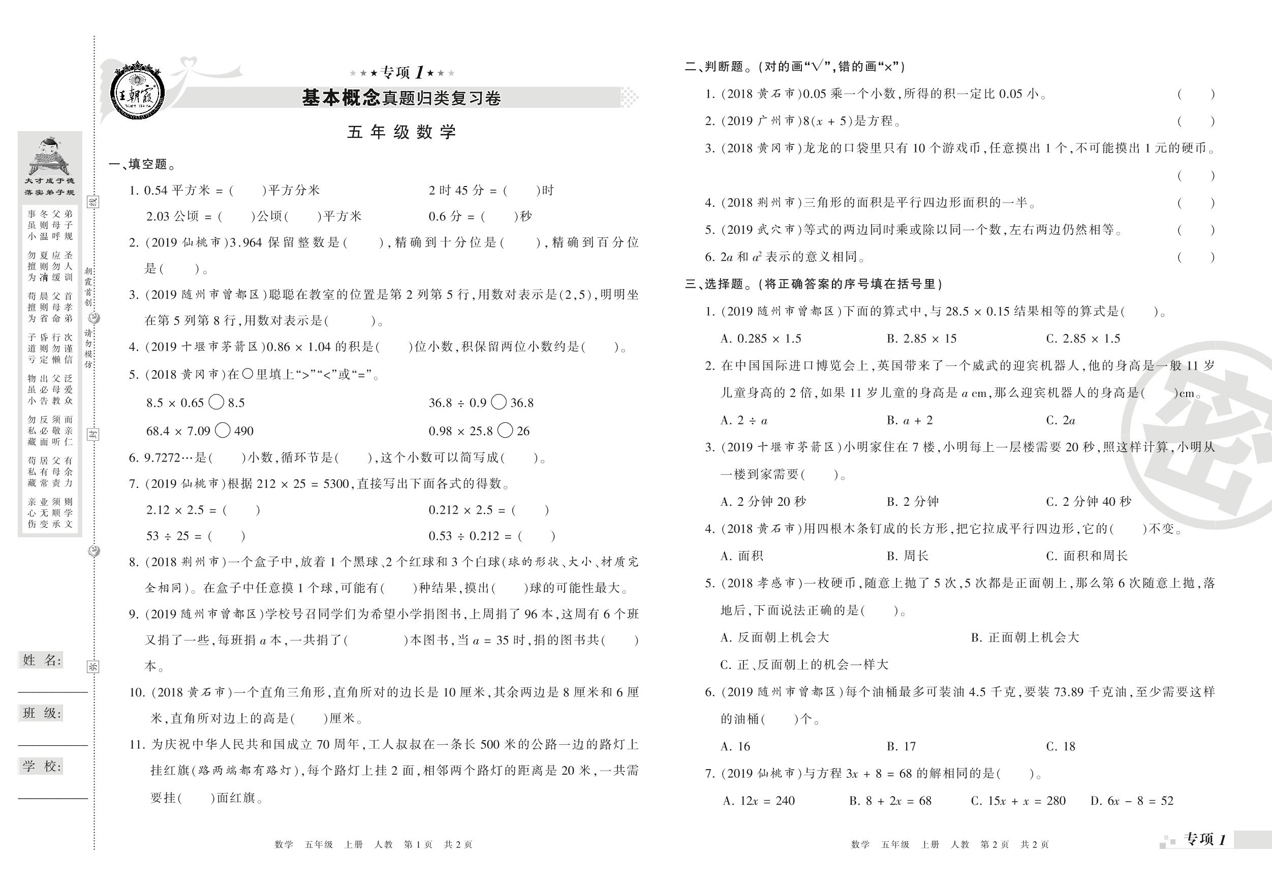 王朝霞期末专项卷——基本概念、计算真题归类复习五年级上册数学(人教版)_R210804172555【0】