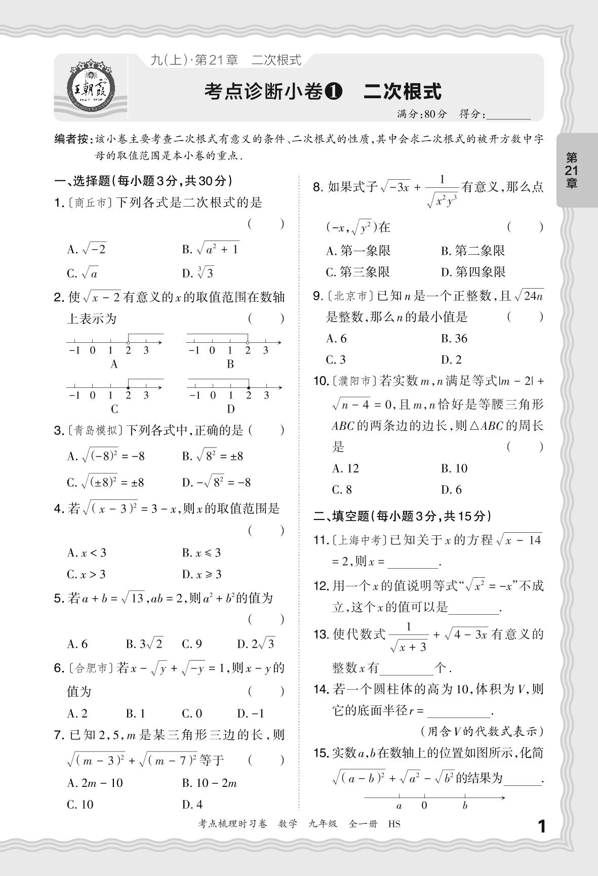 2024上册九年级数学华师版 第21章 考点诊断小卷1 二次根式