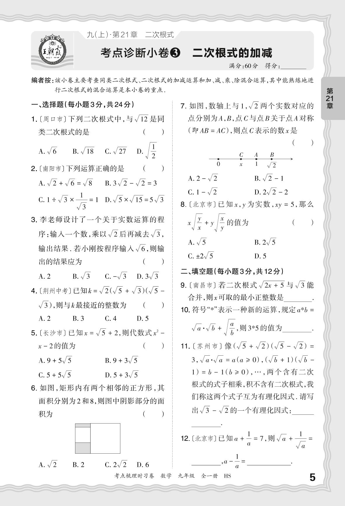 2024上册九年级数学华师版 第21章 考点诊断小卷3 二次根式的加减