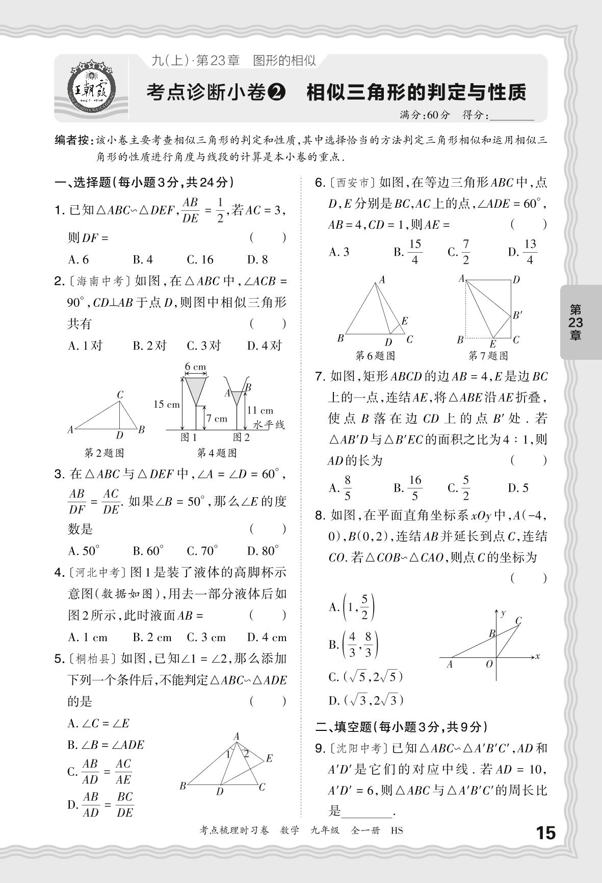 2024上册九年级数学华师版 第23章 考点诊断小卷2 相似三角形的判定与性质