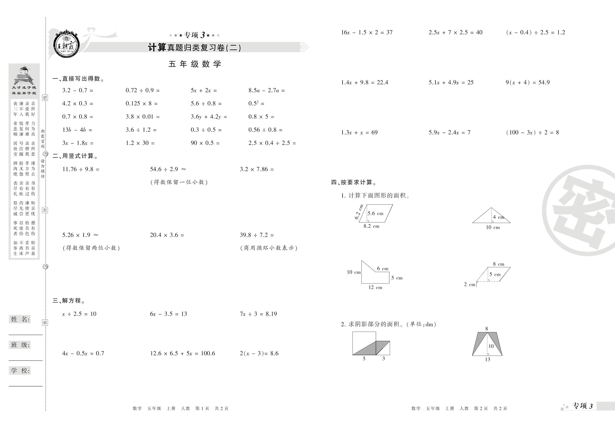 王朝霞期末专项卷——计算、解决问题真题归类复习五年级上册数学(人教版)_R210804172557【0】