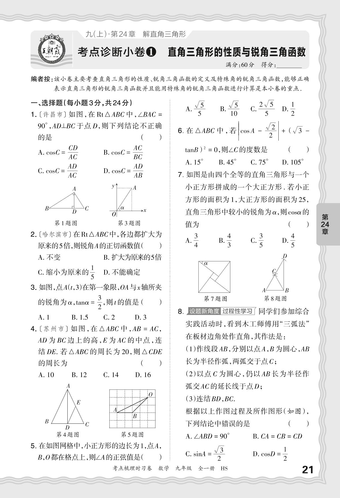 2024上册九年级数学华师版 第24章 考点诊断小卷1 直角三角形的性质与锐角三角函数