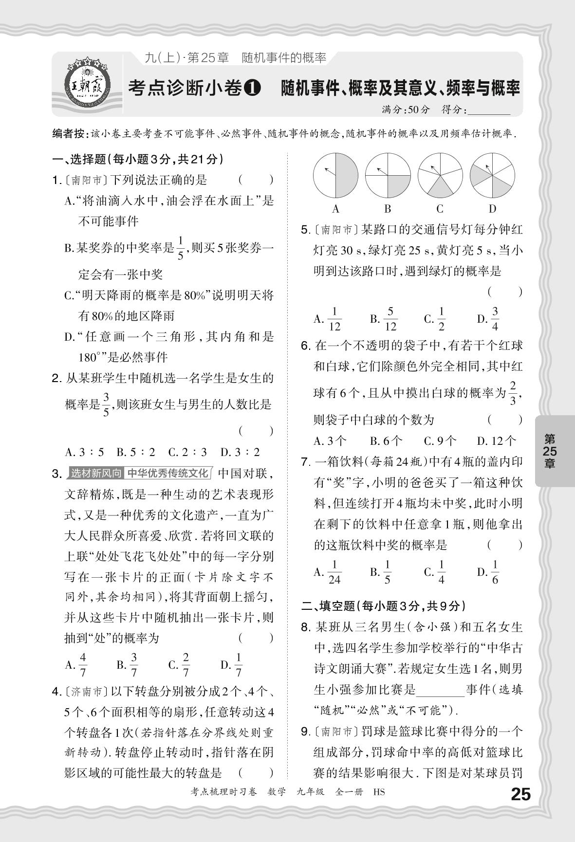 2024上册九年级数学华师版 第25章 考点诊断小卷1 随机事件、概率及其意义、频率与概率