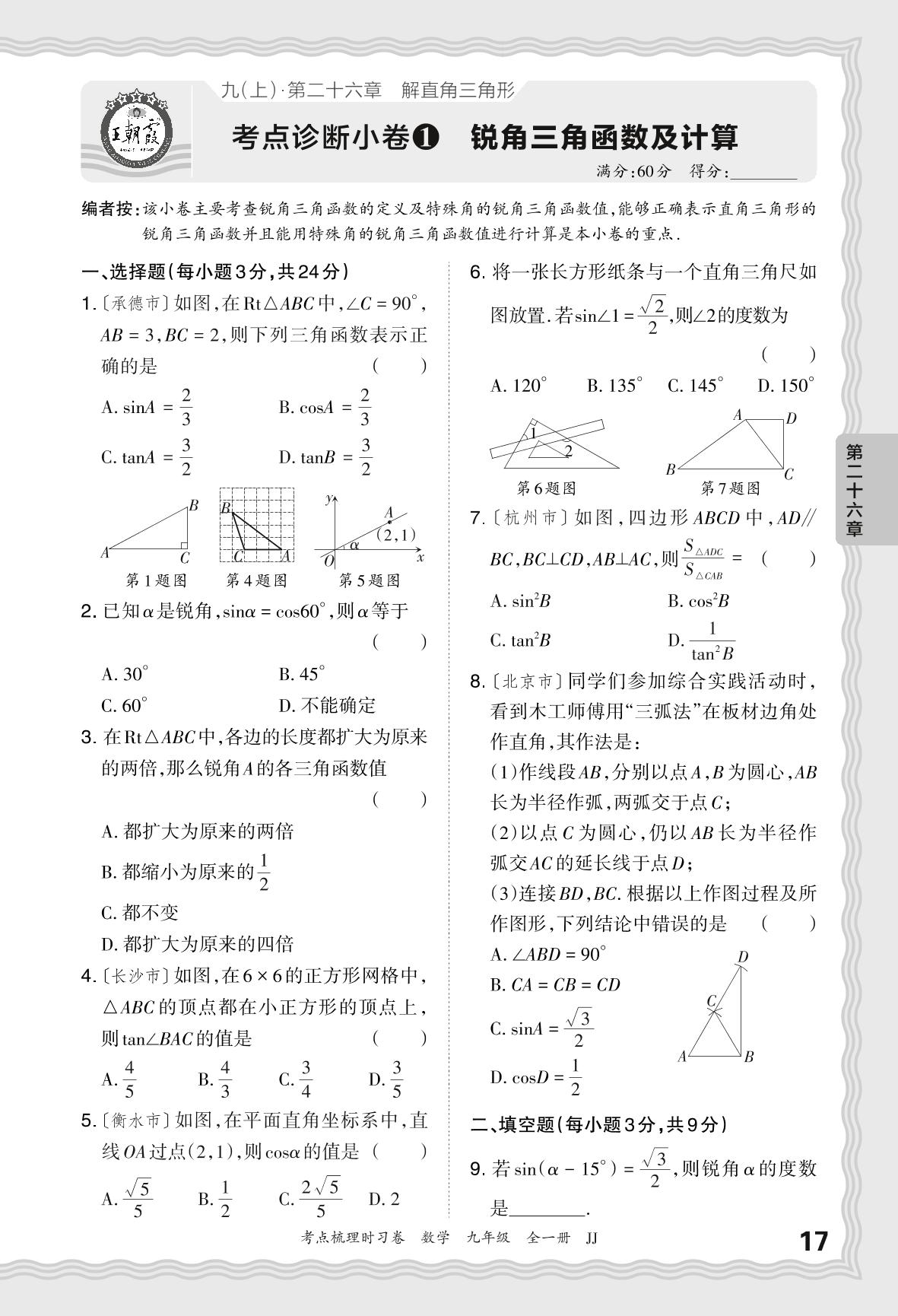 2024上册九年级数学冀教版 第二十六章 考点诊断小卷1 锐角三角函数及计算