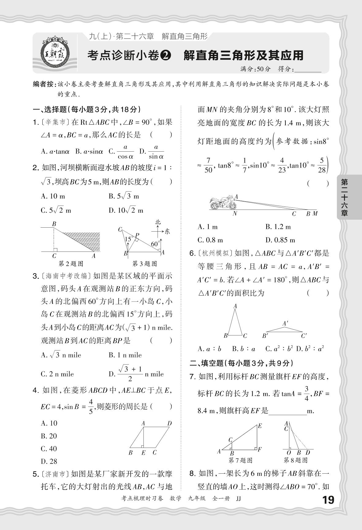 2024上册九年级数学冀教版 第二十六章 考点诊断小卷2 解直角三角形及其应用
