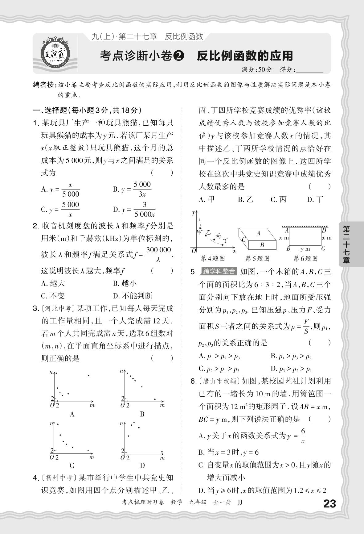 2024上册九年级数学冀教版 第二十七章 考点诊断小卷2 反比例函数的应用