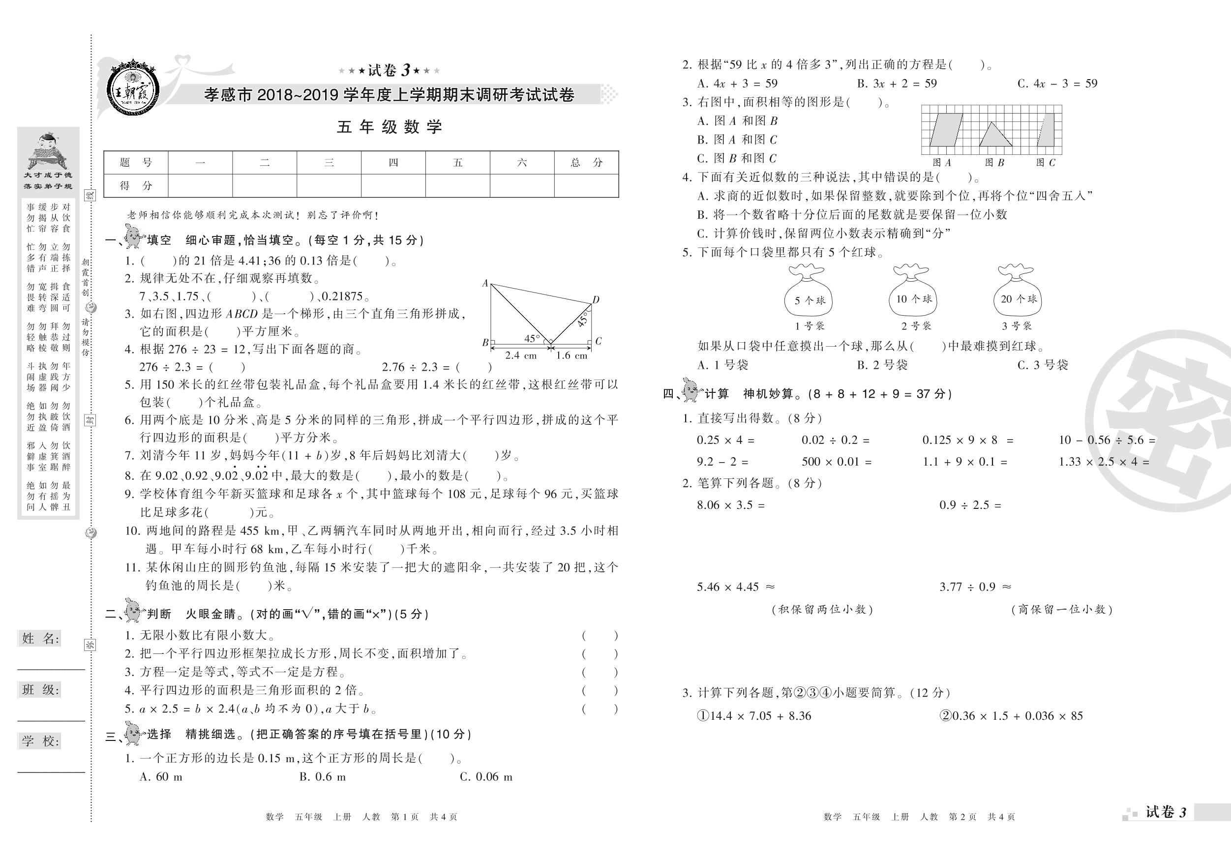 2018-2019学年第一学期孝感市五年级数学试卷(人教版)【3】