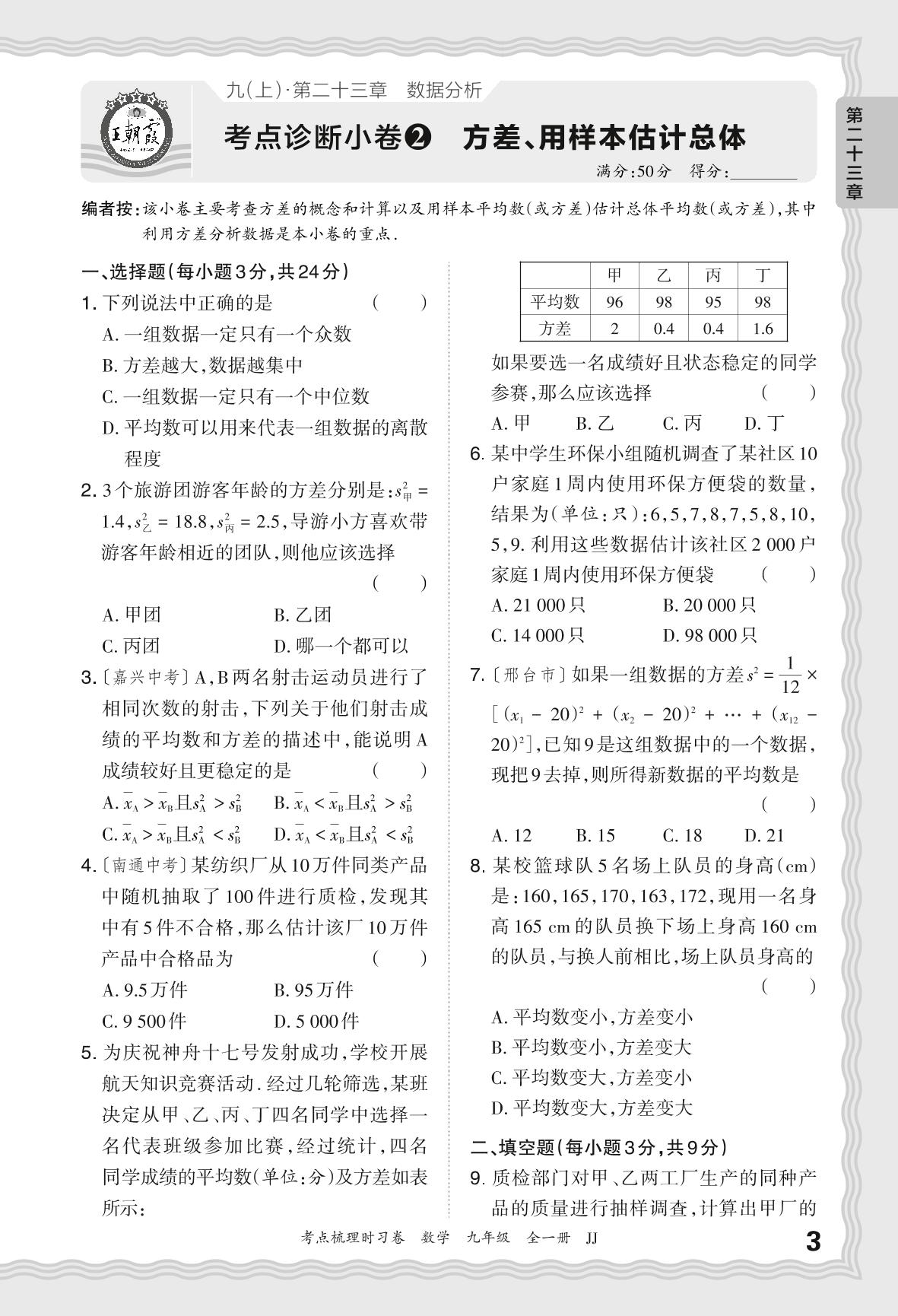 2024上册九年级数学冀教版 第二十三章 考点诊断小卷2 方差、用样本估计总体