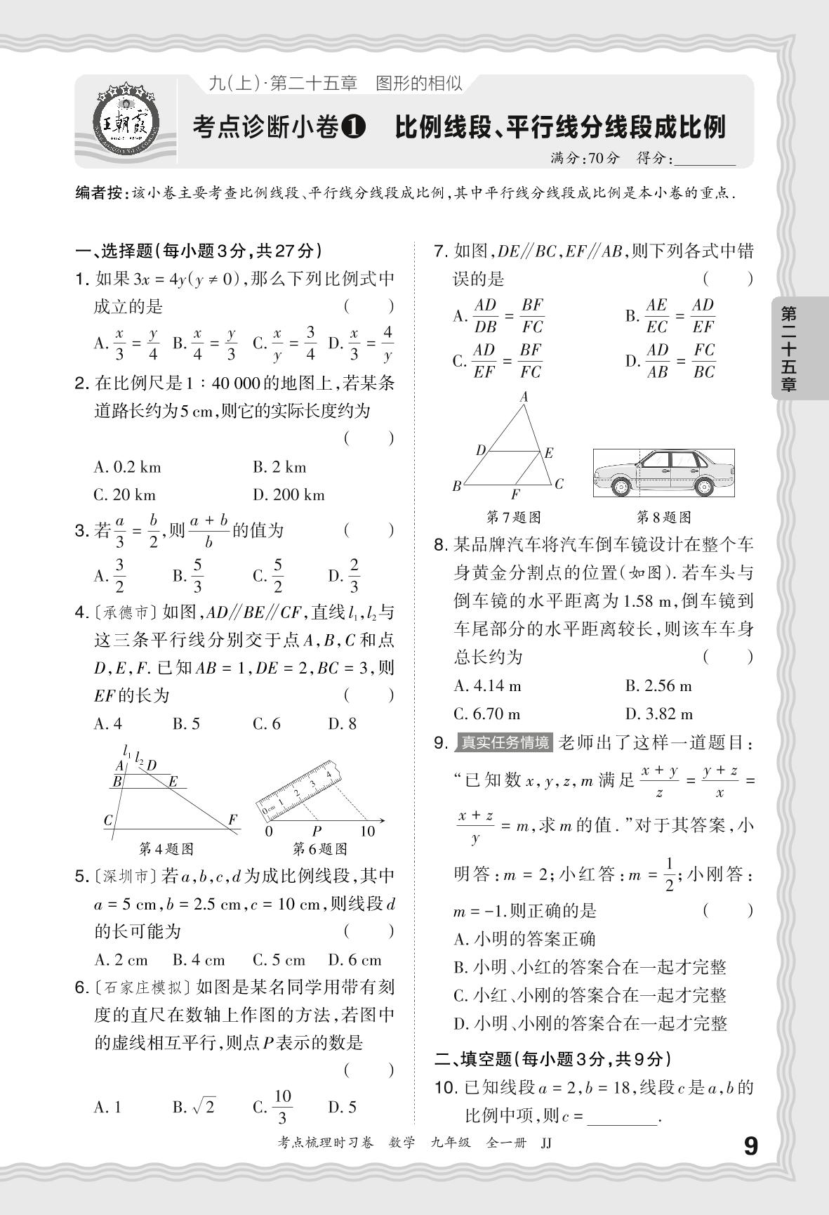 2024上册九年级数学冀教版 第二十五章 考点诊断小卷1 比例线段、平行线分线段成比例