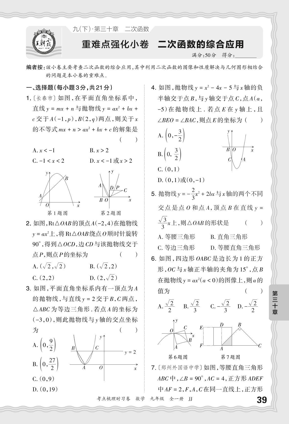 2025下册九年级数学冀教版 第三十章 重难点强化小卷 二次函数的综合应用