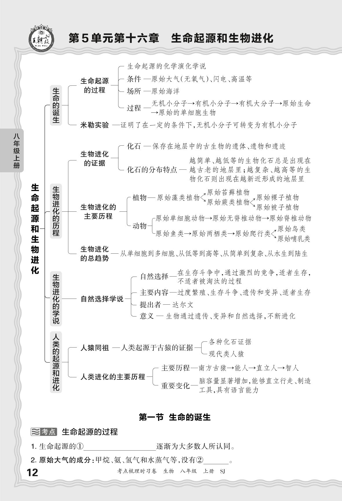 2024上册八年级生物苏教版 考点梳理手册——第5单元第十六章 生命起源和生物进化