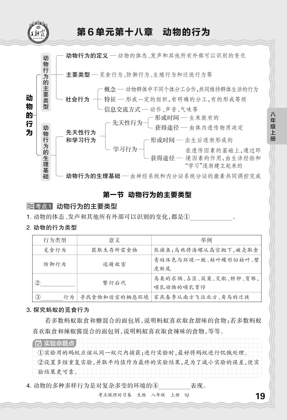 2024上册八年级生物苏教版 考点梳理手册——第6单元第十八章 动物的行为