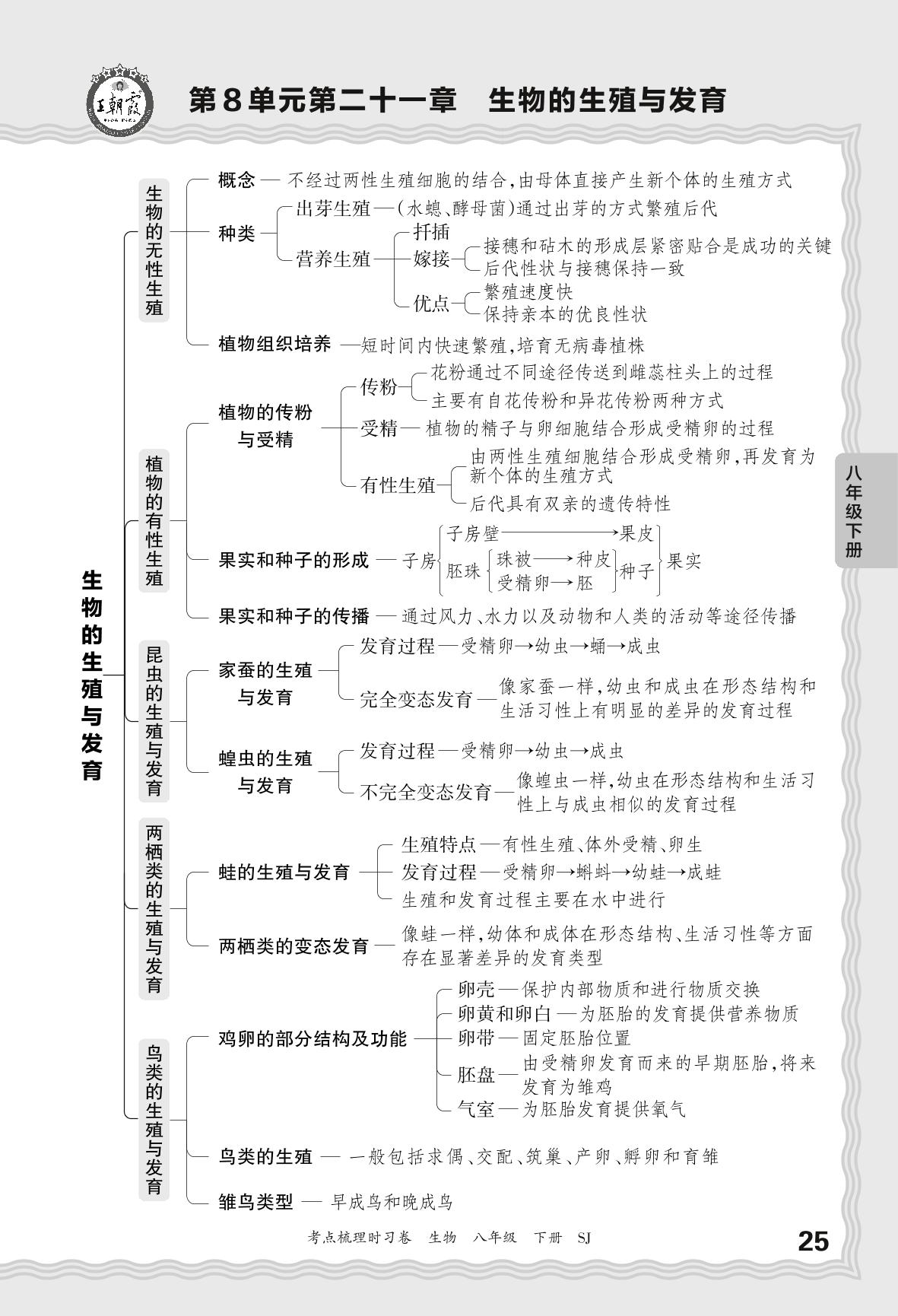2025下册八年级生物苏教版 考点梳理手册——第8单元第二十一章 生物的生殖与发育