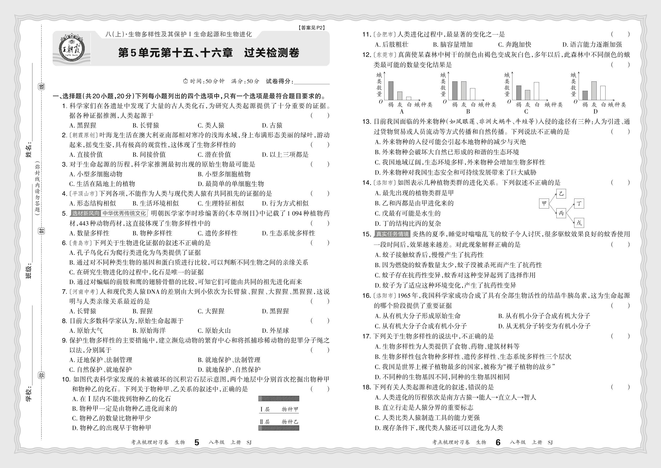 2024上册八年级生物苏教版 第5单元第十五、十六章 过关检测卷