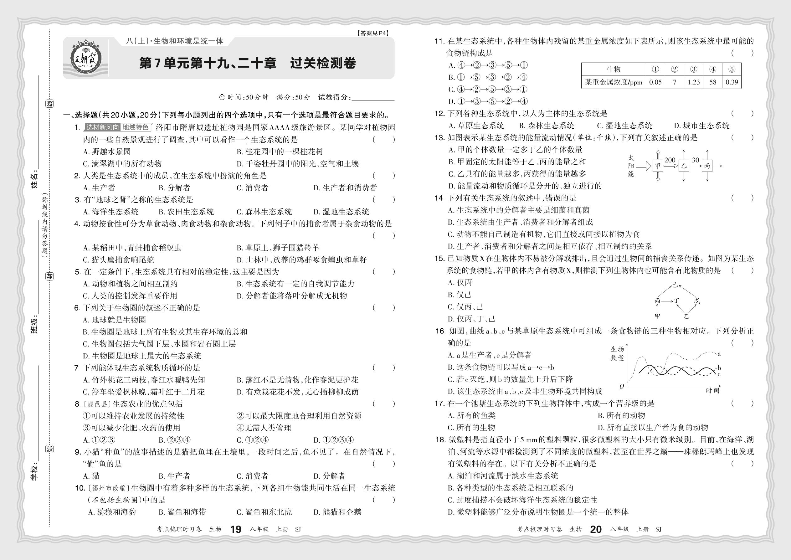 2024上册八年级生物苏教版 第7单元第十九、二十章 过关检测卷