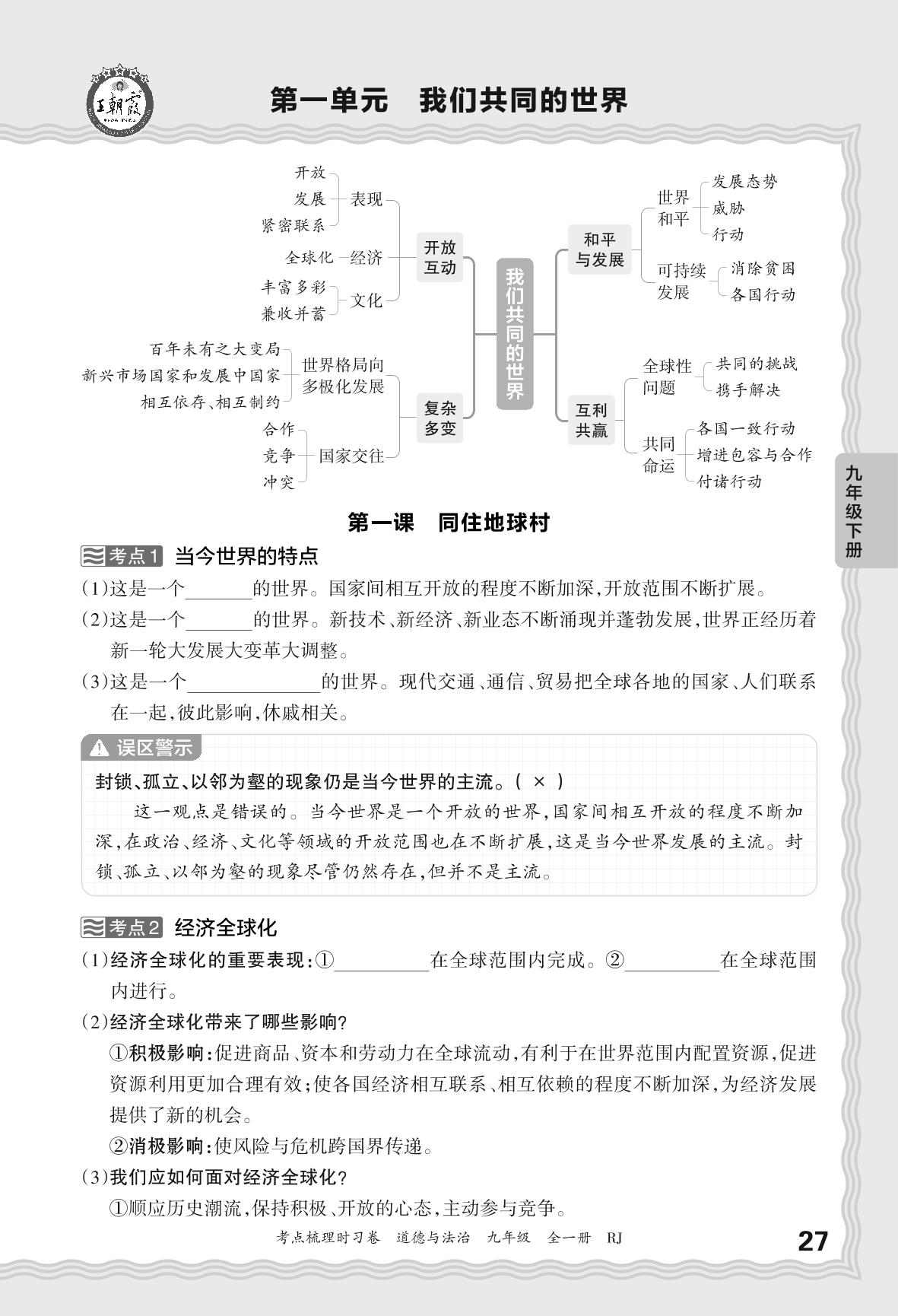 2025下册九年级道德与法治人教版 考点梳理手册——第一单元 我们共同的世界