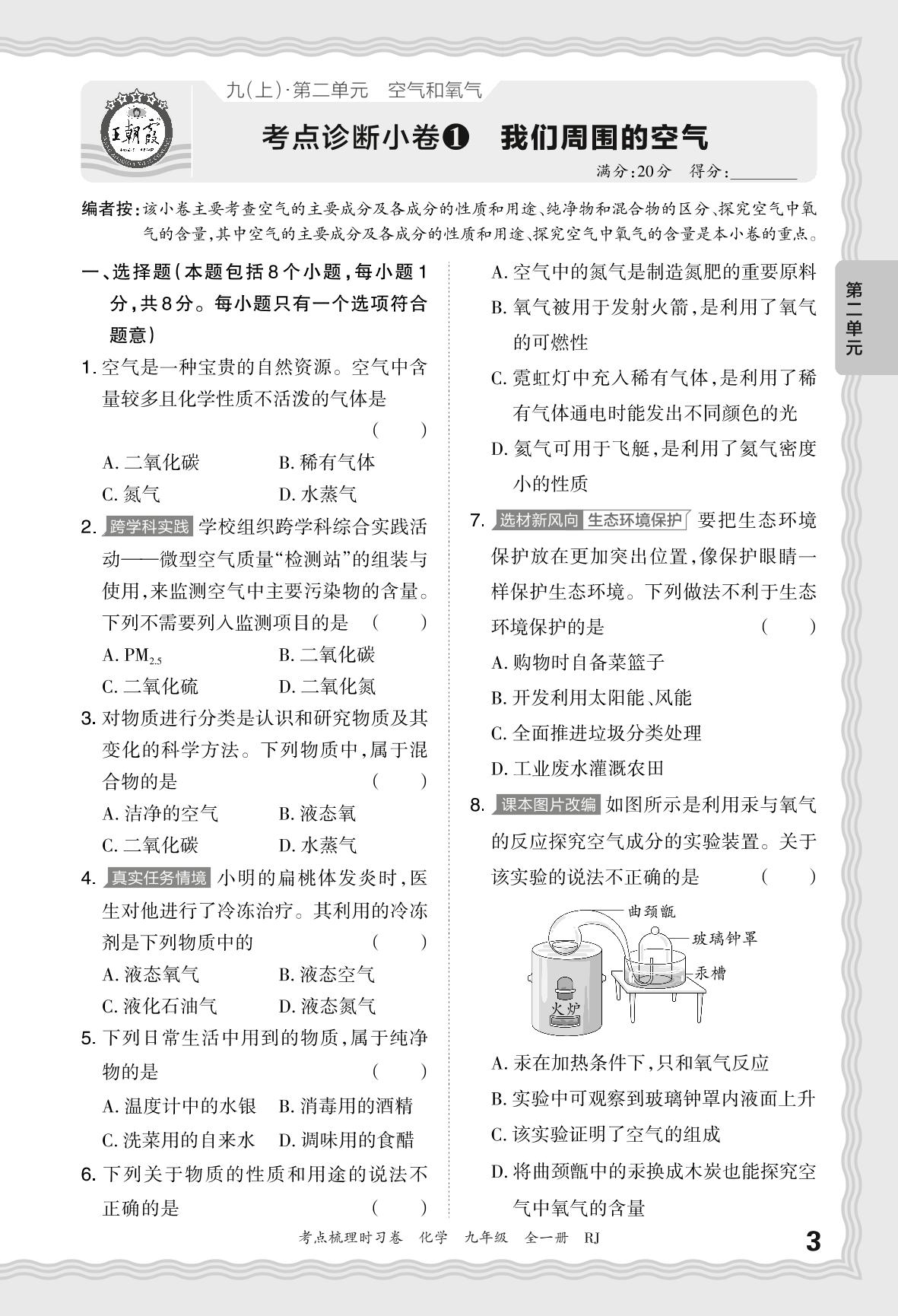 2024上册九年级化学人教版 第二单元 考点诊断小卷 我们周围的空气【1】