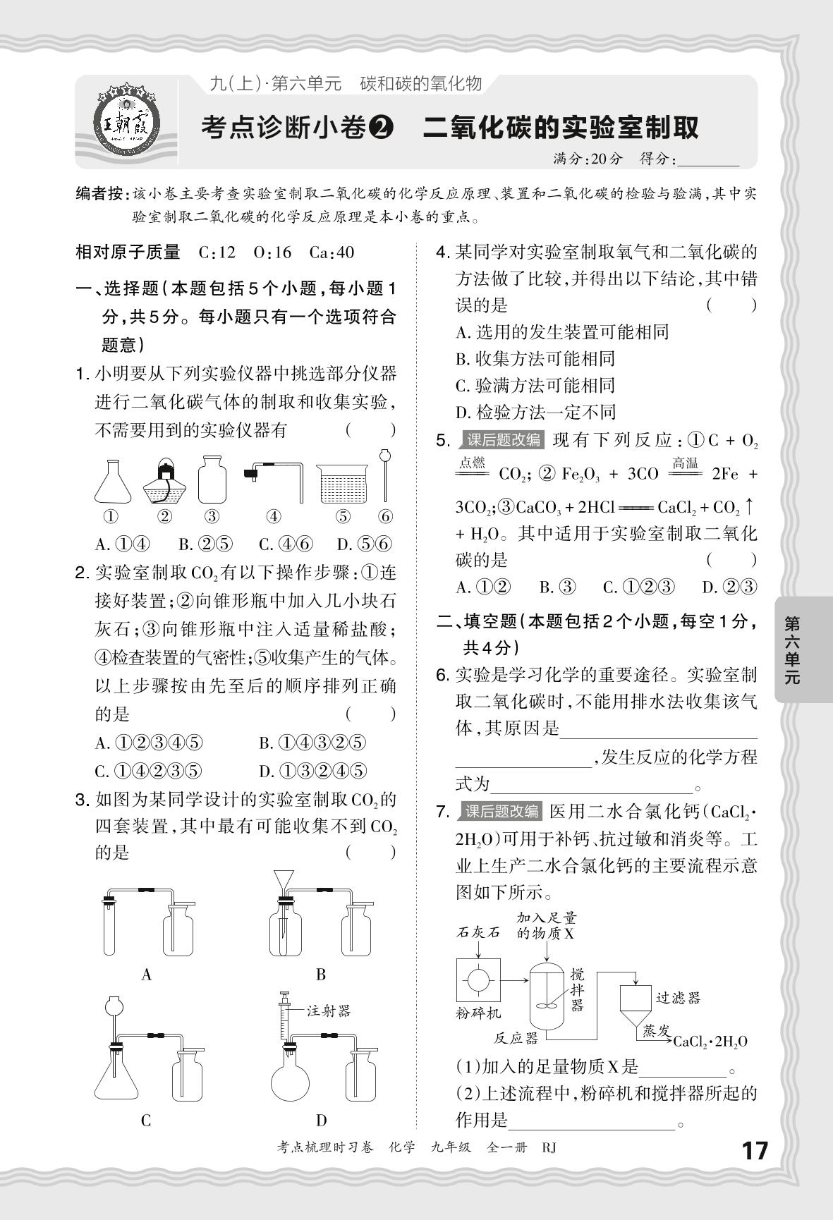 2024上册九年级化学人教版 第六单元 考点诊断小卷 二氧化碳的实验室制取【2】