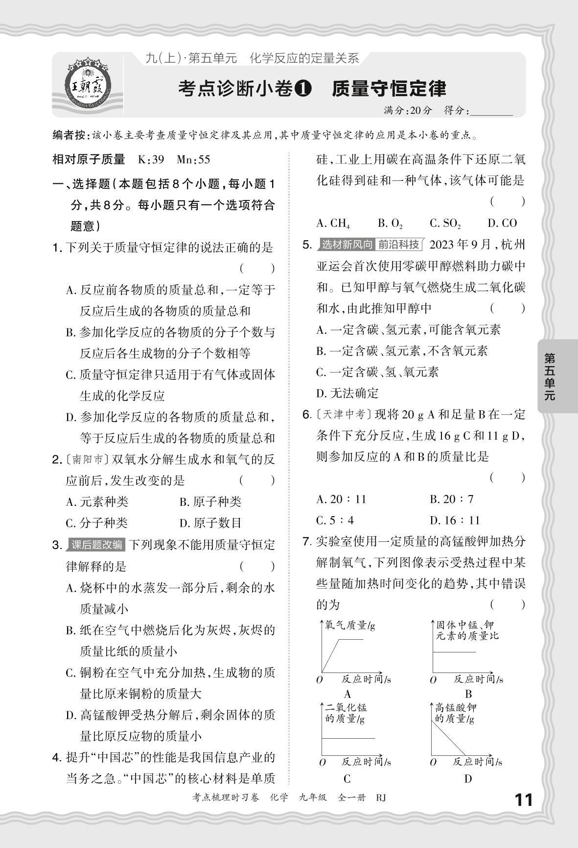 2024上册九年级化学人教版 第五单元 考点诊断小卷 质量守恒定律【1】