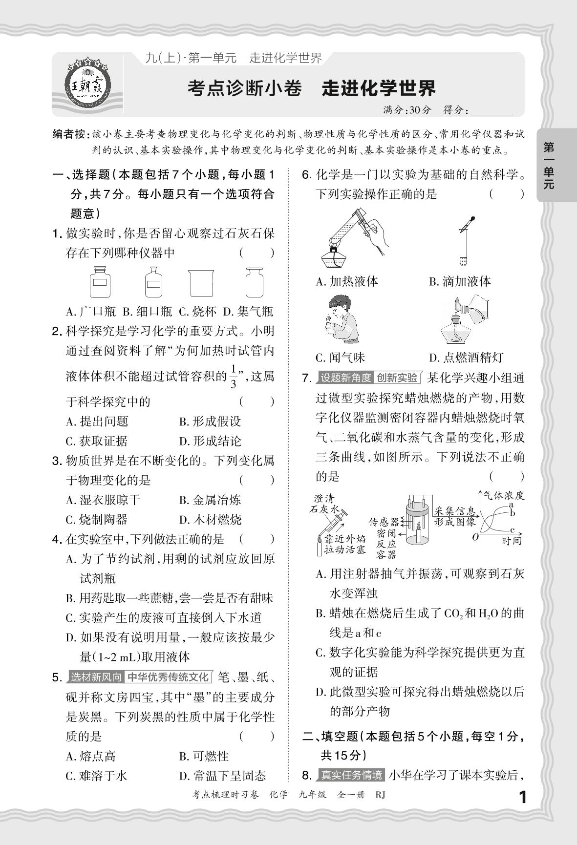 2024上册九年级化学人教版 第一单元 考点诊断小卷 走进化学世界